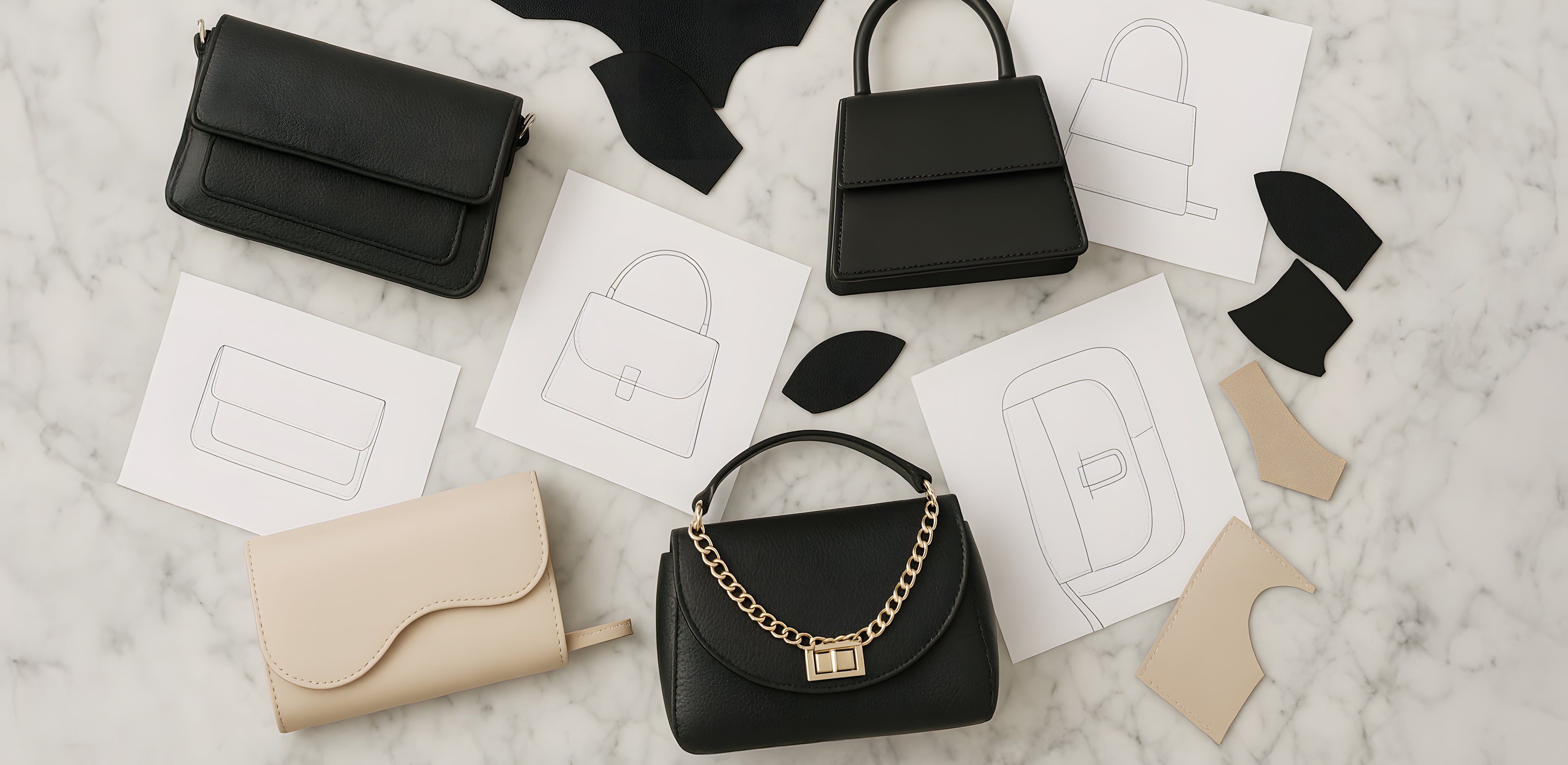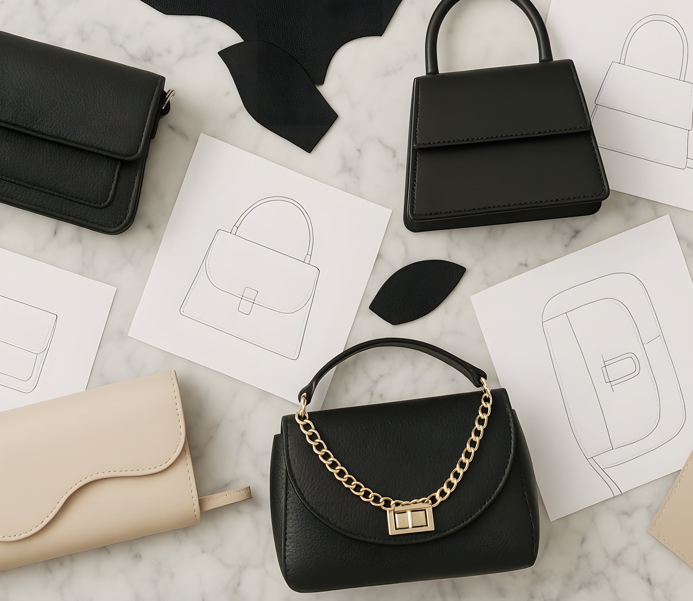 Original sketches transformed into timeless, functional handbags.
